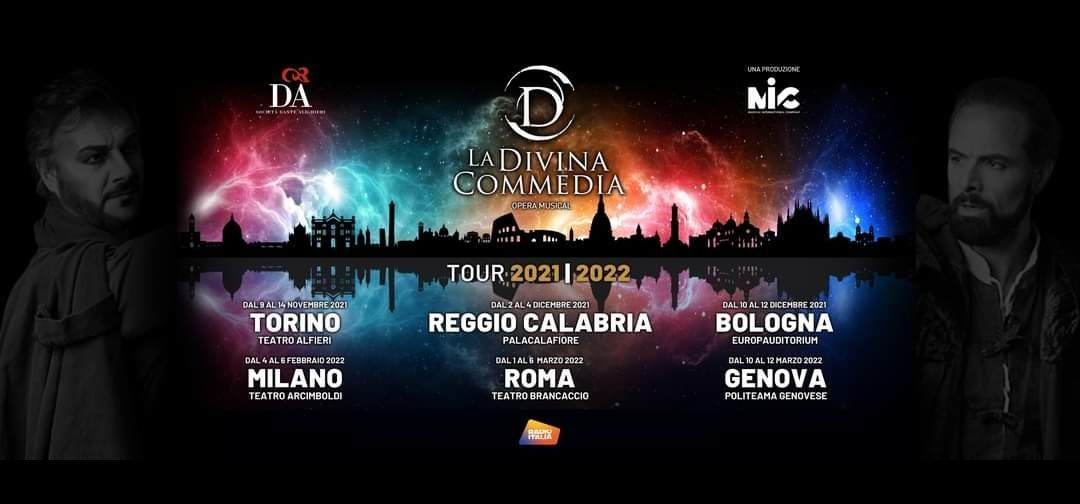 Il più grande racconto dell’animo umano, della sua miseria e della sua potenza, tra vizi, peccati e virtù che non conoscono l’usura del tempo, riprende la forma dello spettacolo di voci, danze e tecnologia in un allestimento così straordinario da far guadagnare aLa Divina Commedia Opera Musical la Medaglia d’oro dalla Società Dante Alighieri, il titolo per ben due volte di Miglior Musical al Premio Persefone edizione 2019 e edizione 2020, e la partecipazione istituzionale nel 2021 con il riconoscimentodel Senato della Repubblica, oltre al sempre costante patrocinio morale della Società Dante Alighieri all’intero tour. Successo, riconoscimenti e presenze di grandissima valenza.