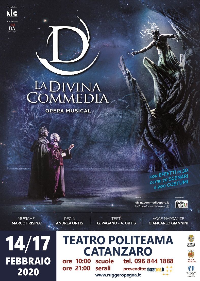 Prodotta da Music International Company, l’opera vanta un team creativo d’eccezione e una troupe di oltre 50 professionisti che porta in tour una produzione innovativa e ambiziosa: un cast di voci eccezionali con un corpo di ballo acrobatico dà infatti vita ai personaggi più emblematici del poema dantesco, che si muovono su suggestive musiche avvolti da proiezioni video di ultima generazione.